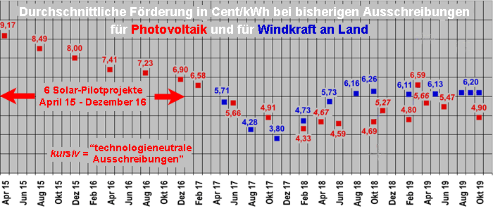 | Diese Grafik zeigt den Förderaufwand bei allen bisherigen Ausschreibungen für Photovoltaik- und Windkraftprojekte, einschließlich drei "technologieneutraler" Auktionen, bei denen nur die Photovoltaik zum Zuge kam. Solaranlagen waren generell weitaus begehrter als Windkraft-Projekte. Ganz rechts sind die Ergebnisse der drei letzten Windkraft-Auktionen zu sehen, bei denen so wenig Nachfrage und Konkurrenz bestand, dass sämtliche Bieter die gesetzte Höchstgrenze von 6,20 Cent/kWh voll ausschöpfen und in Zuschläge verwandeln konnten. |