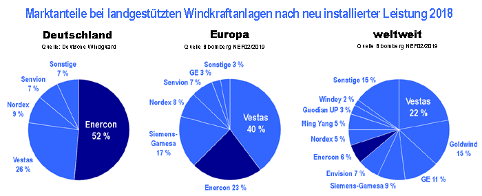 Enercon ist in Deutschland klarer Marktführer, rangiert in Europa aber hinter der dänischen Vestas und hat auf dem Weltmarkt noch vier weitere Konkurrenten vor sich. |