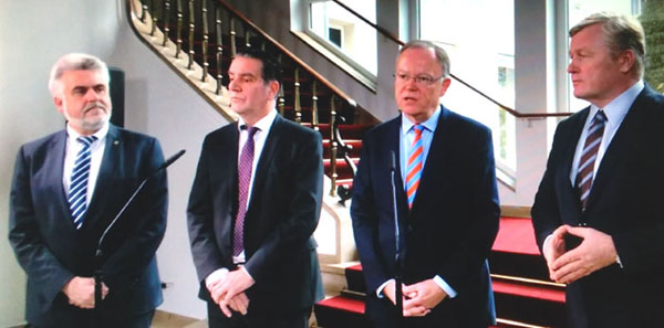 Bei einem Gespräch in der Hannoveraner Staatskanzlei beharrte Enercon auf seinen Plänen. Ersatzweise betonte man auf einer anschließenden Pressekonferenz den Minimalkonsens, dass die Politik handeln müsse, um den Niedergang der deutschen Windindustrie aufzuhalten. Das Foto zeigt v.l.n.r den Wirtschaftsminister von Sachsen-Anhalt, Armin Willingmann, den Enercon-Geschäftsführer Hans-Dieter Kettwig, den niedersächsischen Ministerpräsidenten Stephan Weil und den niedersächsischen Wirtschaftsminister Bernd Althusmann. |