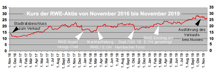 Die Stadtverwaltung wartete schon seit drei Jahren auf eine passende Gelegenheit, ihre RWE-Aktien zu einem einigermaßen günstigen Preis loszuwerden. Die Ermächtigung dazu bildete ein Beschluss, den der Stadtrat am 7. November 2016 gefasst hatte. Der Kurs der RWE-Aktie, der im Januar 2008 mit 100 Euro seinen Höhepunkt erreicht hatte, war bis dahin auf etwa 14 Euro gesunken, und anschließend sank er noch weiter bis auf nicht viel mehr als 11 Euro. Der Konzern schockte seine Aktionäre sogar zweimal mit der kompletten Streichung der immer magerer gewordenen Dividende (160205, 170211). Aus diesem Grund wurde der Verkauf des Aktienpakets, das die Stadt intern der Rheinbahn AG übertragen hatte, vorerst auf Eis gelegt.