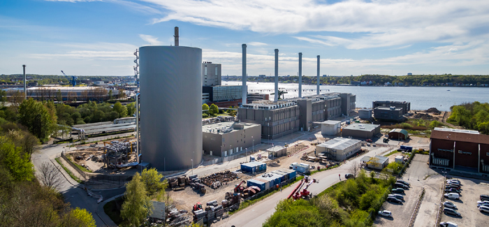 Im Vordergrund ist der 60 Meter hohe Wärmespeicher zu sehen. Rechts