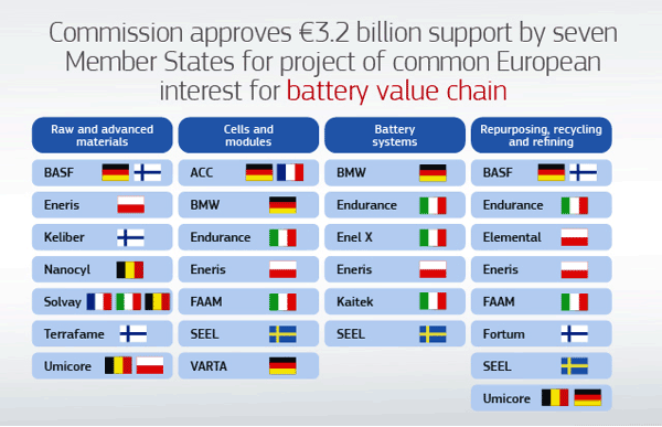 Die EU-Kommission genehmigte am 9. Dezember insgesamt 3,2 Milliarden Euro staatliche Beihilfen zum Aufbau einer europäischen Batteriezellenfertigung. Größter Geldgeber ist Deutschland mit einer genehmigten Obergrenze von 1,25 Milliarden Euro, gefolgt von Frankreich (960 Mio.), Italien (570 Mio.), Polen (240 Mio.), Belgien (80 Mio.), Schweden (50 Mio.) und Finnland (30 Mio.). Das Vorhaben wird von 17 direkt beteiligten Unternehmen aus den sieben Mitgliedstaaten durchgeführt, wobei diese Unternehmen teilweise in mehreren der insgesamt vier Forschungsbereiche und mehreren der sieben Mitgliedsstaaten tätig sind (siehe Grafik). Sie sollen sowohl untereinander als auch mit über 70 externen Partnern – zum Beispiel öffentlichen Forschungseinrichtungen – eng zusammenarbeiten.