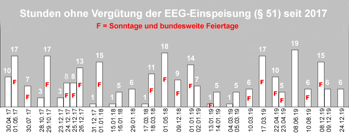 Seit 2017 waren die Spotmarkt-Strompreise an 491 Stunden negativ. Davon entfielen 277 Stunden auf die hier abgebildeten zwanzig Negativpreis-Phasen, die sechs Stunden oder länger dauerten. Gemäß § 51 EEG sinkt dann die gesetzliche Vergütung für eingespeisten Wind- und Solarstrom auf null. Die Grafik lässt erkennen, dass die verringerte Stromnachfrage an Sonn- und Feiertagen ein wichtiger Faktor bei der Entstehung derartiger Negativpreis-Phasen ist, die sich meistens über zwei oder noch mehr Tage erstrecken (aufgrund solcher Überschneidungen rund um die Uhr ergeben sich für die einzelnen Tage oft weniger als sechs Ausfallstunden). Quelle: netztransparenz.de |