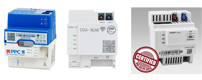 | Mit drei Jahren Verspätung erhielten nun endlich drei voneinander unabhängige Unternehmen die Bescheinigung, dass ihre "intelligenten Meßsysteme" den technischen Mindestanforderungen genügen. Die erste bekam im Dezember 2018 die Power Plus Communications AG PPC (links), die zweite im September 2019 die Sagemcom Dr. Neuhaus GmbH (rechts) und die dritte im Dezember 2019 die EMH metering GmbH & Co (Mitte). Die Geräte weiterer Hersteller befinden sich noch im Zertifizierungsverfahren. |