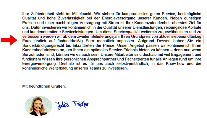 Diese Senkung des Arbeitspreises um 0,01 Cent pro Kilowattstunde hätte die jährliche Stromrechnung der Familie um etwa 35 Cent verringert. Bei einem Durchschnittsverbrauch von 3.500 Kilowattstunden hätte das eine Jahresrechnung von 938,11 Euro anstelle von 938,46 Euro ergeben. Die Ersparnis war also bedeutungslos. Sie diente auch lediglich als Tarnung für den eigentlichen Zweck des Textes, der weiter hinten – beiläufig und unter allerlei sprachlichem Müll versteckt – eine mehr als tausendfach höhere Belastung um jährlich 420 Euro ankündigte: Um die "Servicequalität weiterhin zu gewährleisten und zu verbessern", werde man den Grundpreis "von aktuell sechsundsechzig Komma sechsundneunzig Euro jährlich auf fünfunddreißig Euro monatlich anpassen" (siehe das ähnlich formulierte Kunden-Anschreiben in der Grafik).