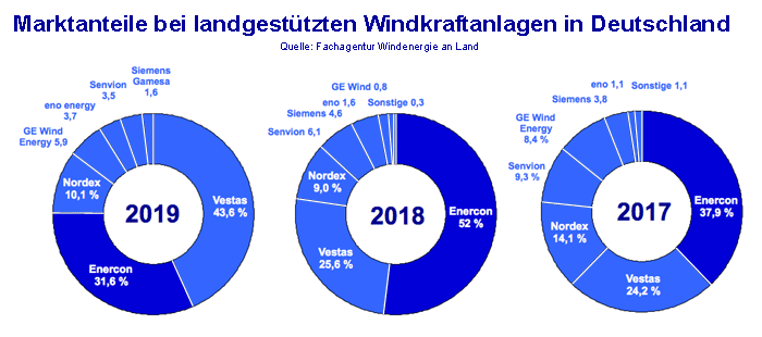Im Februar dieses Jahres hat der Rat der Stadt Aurich das erfolglose Stadtwerke-Projekt offiziell beerdigt, wobei ausgerechnet die EWE zum Wunschkandidaten für die Übernahme der Hinterlassenschaften wurde (200212). Enercon hat inzwischen ganz andere Probleme, als "an seinem Unternehmenssitz ein Modellprojekt für die dezentrale, regionale Energiewende zu realisieren", wie firmenoffiziell die seinerzeit verfolgte Strategie umschrieben wurde. Der einstige Marktführer wurde nämlich von der seit mehr als zwei Jahren andauernden Flaute beim Bau neuer Windkraftanlagen besonders hart getroffen. Während er 2018 mehr als die Hälfte aller neu installierten Windkraft-Leistung in Deutschland erstellte, waren es 2019 nur noch 32 Prozent (siehe Grafik). Nach den bisher vorliegenden Zahlen wird er auch 2020 hinter der dänischen Vestas nur noch den zweiten Platz belegen. Im November vorigen Jahres kündigte er den Abbau von rund 3000 Arbeitsplätzen sowie die Verlagerung eines Teils der Produktion ins Ausland an (191105). In einem internen Schreiben an die Belegschaft räumte die Geschäftsführung Ende 2019 ein, dass die Ursachen dieser Krise "zum Teil hausgemacht" seien.