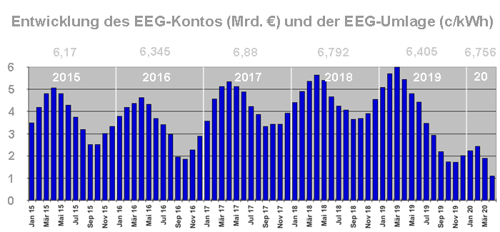 Im März 2019 erreichte das EEG-Konto einen Rekordstand von sechs Milliarden Euro. Bis April 2020 blieb davon noch etwa ein Fünftel übrig, obwohl die EEG-Umlage, die in den Jahren 2018 und 2019 zum ersten Mal leicht rückläufig war, inzwischen wieder erhöht wurde. Das weitere Absinken bis tief in die roten Zahlen ist absehbar. |