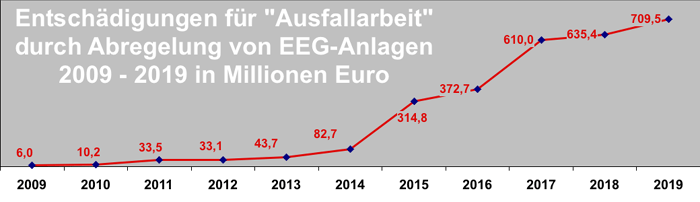 | Die Entschädigungen für "abgewürgten" EEG-Strom waren schon 2017 mehr als hundertmal so hoch wie 2009. Im selben Zeitraum stieg die jährliche EEG-Stromerzeugung um das zweieinhalbfache von 75 auf 188 Terawattstunden. Die Netzengpässe haben also stark überproportional zugenommen – nicht zuletzt wegen des grenzenlosen Stromhandels und der Verstopfung der Leitungen mit Strom aus konventioneller Erzeugung. |