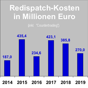 Bei den konventionellen Redispatch-Maßnahmen ging die Gesamtmenge der betroffenen Stromerzeugung gegenüber dem Vorjahr von 14.875 auf 13.323 GWh zurück. Davon entfielen 6.958 GWh auf Einspeisereduzierungen und 6.563 GWh auf Einspeiseerhöhungen von konventionellen Markt- und Netzreservekraftwerken. Die Kosten verringerten sich von 385,8 auf 270,0 Millionen Euro (siehe Grafik). Allerdings war beim sogenannten "Countertrading" mehr als eine Verdoppelung und ein daraus resultierender Anstieg der Kosten dieses Redispatch-Segments von 36,2 auf 62,9 Millionen Euro festzustellen. Wie die Bundesnetzagentur dazu feststellt, lässt sich dieser Anstieg größtenteils auf die bilaterale Vereinbarung zwischen Deutschland und Dänemark zurückführen, die 2018 von der EU-Kommission erzwungen wurde (181207, 180302). Diese verpflichtete den Netzbetreiber TenneT, die Kapazitäten für Stromimporte aus Dänemark bis Juli 2019 auf 1.300 MW und bis 2026 auf 2.625 MW zu erhöhen. Solange die verlangten Leitungskapazitäten nicht zur Verfügung stehen, müssen sie durch "Countertrading" simuliert werden. Die Kosten dafür gehen in die Netzentgelte und letztendlich in die Stromrechnungen der Verbraucher ein.