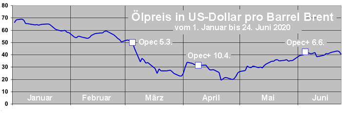 Der Ölpreis hat sich nach dieser Entscheidung bei ungefähr 40 Dollar pro Barrel Brent stabilisiert (siehe Grafik). Zuvor war er seit Ende April fast kontinuierlich gestiegen. Die am 10. April beschlossenen Förderbeschränkungen der Opec-plus-Staaten konnten also einen weiteren Verfall des Brent-Preises von 31,48 bis auf 19,33 Euro zunächst nicht verhindern. Vermutlich lag das am Überangebot, das erst abgebaut werden musste, sowie an der Unsicherheit, wieweit die Beschlüsse tatsächlich befolgt würden. Wie aus der Verlautbarung vom 6. Juni hervorgeht, haben tatsächlich einige Förderstaaten im Mai und Juni die beschlossenen Kürzungen nicht erfüllt. Sie hätten aber ihre Bereitschaft bekundet, dies im Juli, August und September durch zusätzliche Produktionsminderungen auszugleichen.