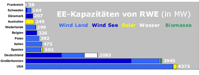 Der größte deutsche Stromerzeuger baut damit den Anteil der Erneuerbaren an seinem Geschäft weiter aus. Auf seinen inländischen Strom-Mix wirkt sich das aber nur geringfügig und im aktuellen Fall sogar überhaupt nicht aus. Noch im November vergangenen Jahres entfielen nach RWE-Angaben von den insgesamt 4660 MW Windkraftleistung an Land, über die der Konzern weltweit verfügte, gerade einmal 38 MW auf Deutschland, was weniger als ein Prozent war. Auf dem ersten Platz rangierten die USA mit fast achtzig Prozent (3690 MW). Mit großem Abstand folgten RWE-Anlagen in Italien (385 MW), Großbritannien (281 MW), Polen (143 MW) und Schweden (124 MW). Etwas besser sah es bei der Offshore-Erzeugung aus. Aber auch hier entfiel die installierte Gesamtleistung von 2479 MW mit 1483 MW größtenteils auf Großbritannien, während Deutschland mit einer halb so großen Kapazität (740 MW) auf dem zweiten Platz lag, gefolgt von Dänemark (207 MW) und Schweden (48 MW). Inzwischen nennt der Konzern auf seiner Transparenz-Seite höhere Zahlen für die Windkraft an Land und auf See in Deutschland (siehe Grafik). Am Mißverhältnis zu seinen ungleich größeren Erneuerbare-Investitionen im Ausland – vor allem in den USA und Großbritannien – hat sich aber nichts wesentliches geändert.