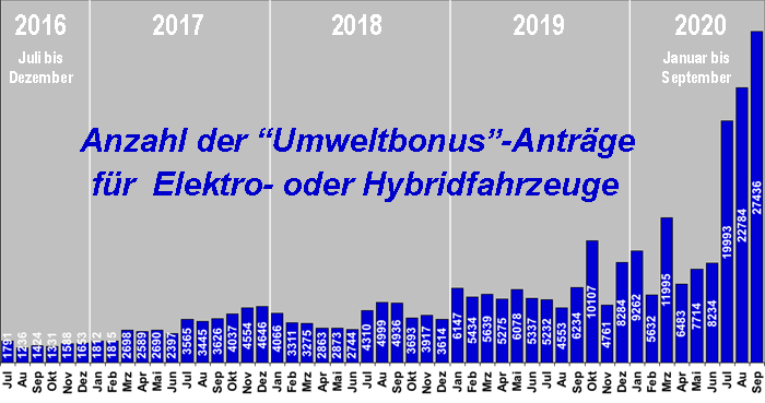 | Der "Umweltbonus" zur Förderung der Elektromobilität war zunächst ein Fehlschlag und führte lediglich zu Mitnahmeeffekten, die den Bundesrechnungshof auf den Plan riefen (180801). Erst nach der Verlängerung des Angebots um ein Jahr nahm ab 2019 die Zahl der Anträge allmählich zu (190609). Für einen weiteren Schub sorgte dann die Aufstockung und Verlängerung der Prämien bis Ende 2025, die im November 2019 vorgenommen wurde (200207). Aber erst nach der im Juni 2020 beschlossenen Verdoppelung der Staatsprämien (200606) schossen die Antragszahlen so in die Höhe, wie man sich das anfangs vorgestellt hatte (200811). |