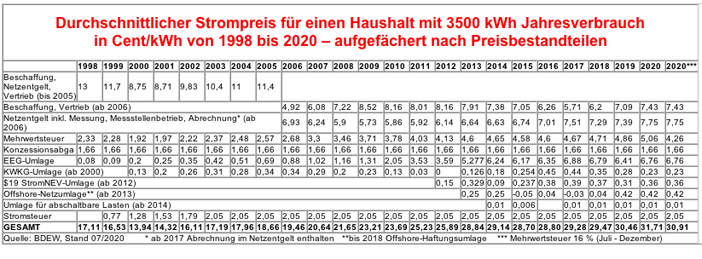 Aussagekräftiger als die Prognosen der Vergleichsportale ist diese BDEW-Statistik, wonach sich der Strompreis für einen Haushalt mit 3500 Kilowattstunden Jahresverbrauch binnen zwanzig Jahren mehr als verdoppelt hat. Dabei ist dieser Anstieg fast nur auf die zunehmende Befrachtung des Strompreises mit staatlich auferlegten Belastungen zurückzuführen: Zum Beispiel entfallen von den 31,71 Cent, die in diesem Jahr die Kilowattstunde kostet, lediglich 15,18 Cent auf Beschaffung, Netzentgelte und Vertrieb. Das sind lediglich 2,18 Cent mehr als 1998. Dagegen sind Steuern, Abgaben und Umlagen pro Kilowattstunde um 16,53 Cent gestiegen. Der Anteil staatlich bedingter Belastungen des Strompreises hat sich somit von 24 auf 52 Prozent erhöht. (Vergrößern)