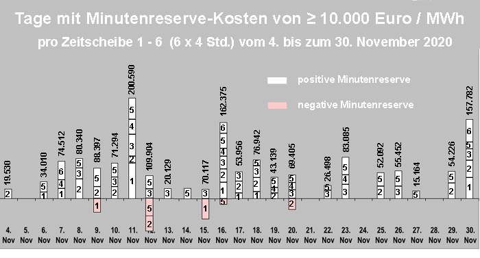 Die Bundesnetzagentur hat alle Tage penibel aufgelistet, an denen zwischen dem 4. November und dem 14. Dezember die Preise für Sekundärregelenergie (aFFR) und Minutenreserve (MFRR) in mindestens einer der sechs Zeitscheiben die Grenze von 9.999,99 Euro pro Megawattstunde überschritten. Diese Grafik veranschaulicht die so gewonnenen Ergebnisse für die Minutenreserve im November. Wie man sieht, wurde die genannte Preisgrenze nur an 4 von 27 Tagen nicht überschritten. Am 16. November waren sogar alle sechs Zeitscheiben betroffen. Am höchsten waren die so verursachten Kosten mit 200.590 Euro am 11. November. Insgesamt addierten sich die hier dargestellten Beträge zu 1,63 Millionen Euro. |