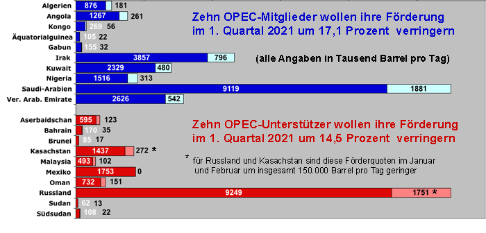 | So sehen die Fördermengen aus, die am 4. Januar für zehn Opec-Mitglieder (blau) und zehn Opec-Unterstützer (rot) für das erste Quartal 2021 vereinbart wurden. Am rechten Ende der Balken sind die Abstriche gegenüber der bis Jahresende 2020 geltenden Regelung zu sehen. Sie sind um etwa zwei Drittel geringer als ursprünglich in Aussicht gestellt wurde. Der Ölpreis steigt deshalb vorerst weiter. |