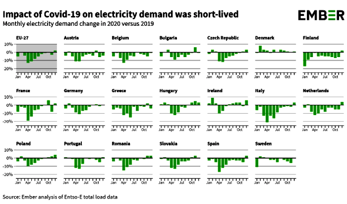 In den 27 EU-Staaten sank die Stromnachfrage 2020 um insgesamt vier Prozent und erreichte im April ihren Tiefpunkt, um sich dann bis zum Beginn des Winters wieder auf das Niveau des Vorjahres zu erholen. Noch stärkere Rückgänge als in Deutschland (-14,6 %) gab es dabei in Italien (-21%), Frankreich (-19%) und Spanien (-17%). Die obige Übersicht entstammt der Studie "The European Power Sector in 2020", die am 25. Januar von Agora Energiewende und der britischen Klimaschutzorganisation Ember veröffentlicht wurde (210108). |