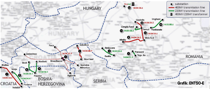 Mit der Abschaltung der serbischen Übertragungsleitung von Novi Sad nach Subotica um 14:04:48:9 Uhr ging die Winkelstabilität endgültig verloren und es kollabierten binnen 20 Sekunden zahlreiche weitere Übertragungsleitungen von der Grenze zwischen Rumänien und der Ukraine bis hinunter zum Mittelmeer in der Region Dalmatien. Dadurch zerfiel das kontinentaleuropäische Verbundsystem in zwei Teile mit unterschiedlicher Frequenz. (Vergrößern) |