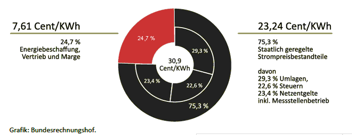 Mit dieser Grafik unterstreicht der Bundesrechnungshof in seinem Bericht, dass drei Viertel des Haushalts-Strompreises der staatlichen Regelung unterliegen. Sie zeigt die Zusammensetzung des Strompreises für private Haushalte mit einem Jahresverbrauch von 2500 bis 5000 kWh im Jahr 2019 und basiert auf dem Monitoringbericht der Bundesnetzagentur. Zu den "echten" Kostenbestandteilen des Strompreises gehören freilich nicht nur die 24,7 Prozent für Energiebeschaffung, Vertrieb und Marge, sondern auch die staatlich geregelten Netzentgelte sowie die Konzessionsabgaben der Stromnetzbetreiber an die Kommunen (5,3 Prozent). Die Kosten der Erneuerbaren-Förderung, die mit 20,8 Prozent die Hauptlast des Umlagen-Anteils von 29,3 Prozent ausmachen, sowie der KWK-Förderung (0,9 Prozent) sollten dagegen sinnvollerweise über den Bundeshaushalt finanziert werden. So lautet die Empfehlung einer vom Bundeswirtschaftsministerium berufenen Expertenkommission. Außerdem soll die Stromsteuer (6,6 Prozent) durch Senkung auf den EU-Mindestsatz weitgehend abgeschafft werden (200603). Zusätzlich wäre zu überlegen, ob für ein absolut lebenswichtiges Gut wie Strom nicht die ermäßigte Mehrwertsteuer gelten müsste. Bisher verteuert sie alle Preisbestandteile einschließlich der Stromsteuer um weitere 19 Prozent. |