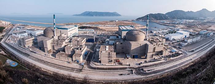 Das Kernkraftwerk Taishan liegt an der Küste des Südchinesischen Meeres. Die beiden Druckwasserreaktoren vom Typ EPR sind seit 2018 bzw. 2019 in Betrieb. Sie verfügen jeweils über eine Leistung von 1750 MW (brutto) bzw. 1660 MW (netto). Links ist der Reaktor 1 zu sehen, bei dem defekte Brennelemente eine erhöhte radioaktive Belastung des Primärkreislaufs verursachen. Foto: EDF