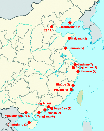 China betreibt derzeit 49 Leistungsreaktoren an 14 KKW-Standorten. Sie wurden alle an der Küste zum Pazifik errichtet, wo sich auch das das wirtschaftliche Leben des Landes konzentriert. Außerdem gibt es in der Nähe von Peking den Versuchsbrüter CEFR , der seine bescheidene Leistung von 20 MW ebenfalls ins Netz einspeist. Quelle: IAEA