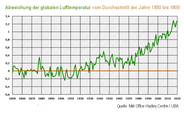 Als Referenz für den Anstieg der Erderwärmung dient die durchschnittliche globale Lufttemperatur in der zweiten Hälfte des 19. Jahrhunderts. Wie diese Grafik erkennen lässt, hat die Durchschnittstemperatur seitdem schon um 1,3 Grad zugenommen. |