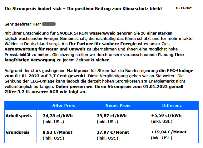 Zuerst das übliche Gesülze, dann eine "Preisanpassung" um effektiv 58 Prozent: Kundenanschreiben der "Saubere Energie GmbH" (siehe weiter unten) |