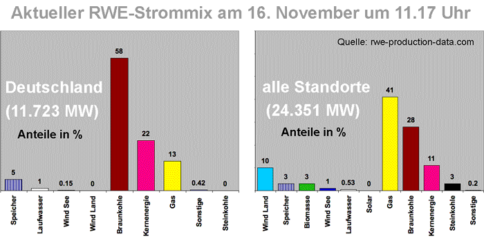 Kohle, Kernenergie und Gas sind für RWE noch immer die wichtigsten Stromquellen. Das verdeutlicht diese Momentaufnahme der gesamten RWE-Erzeugungsleistung an einem November-Montag um die Mittagszeit, wie sie sich aus den Daten unter rwe-production-data.com ergibt. Auf der linken Seite erreichen in Deutschland die konventionellen Kraftwerke sogar einen Anteil von 93 Prozent an der Gesamtleistung. Rechts sind es an allen Standorten zusammengenommen 83 Prozent. Braunkohle- und Kernkraftwerke betreibt RWE allerdings nur noch in Deutschland. Bei der konzernweiten Betrachtung aller Standorte schrumpfen deshalb diese Leistungsanteile von 58 auf 28 Prozent bzw. von 22 auf 11 Prozent. Zugleich steigt aber der Anteil der Gas-Kraftwerksleistung von 13 auf 41 Prozent. – Zu beachten ist dabei, dass beide Grafiken auch die Stromerzeugung von Kraftwerken enthalten, bei denen RWE nicht der alleinige Eigentümer ist. "Technisch ist das anders nicht darstellbar", hieß es von RWE dazu.