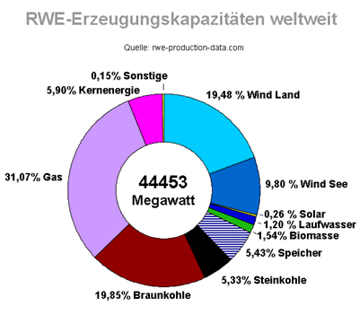 So sieht nach offiziellen Angaben der weltweite Mix der RWE-Erzeugungskapazitäten aus. Allerdings sind auch hier solche Kraftwerke miteinbezogen, bei denen RWE nicht der alleinige Eigentümer ist.
