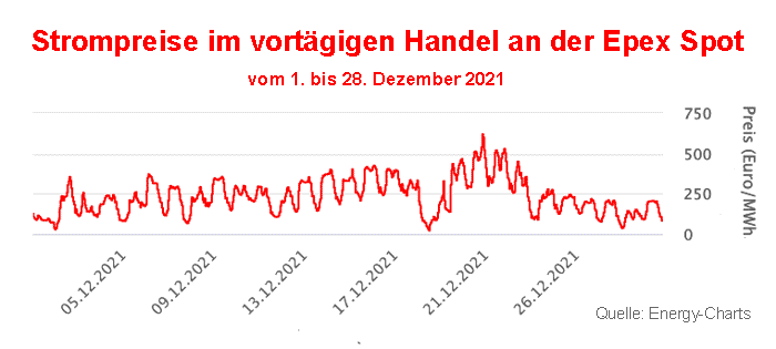 Außer Rand und Band: Die Spotmarkt-Preise für Strom erreichten im Dezember neue Rekordhöhen. Der absolute Gipfel wurde am 21. Dezember für die Stunde ab 17 Uhr mit 620 Euro pro Megawattstunde erreicht. Kurz vor Monatsende lag der Dezember-Durchschnittspreis bei 232 Euro/MWh. |