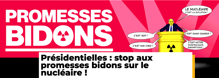 Die französische Anti-Kernkraft-Organisation "Sortir du nucléaire" warnt mit dieser Abbildung vor den "falschen Versprechungen" (promesses bidons), mit denen etliche Kandidaten der bevorstehenden Präsidentschaftswahl die Kernenergie als ideale Energiequelle lobpreisen und zu verharmlosen versuchen. Der Redner hinter dem "bidon" mit radioaktivem Müll ist bewußt neutral gehalten. Er symbolisiert nicht nur Macron, sondern steht ebenso und geschlechtsübergreifend für dessen rechtsextremistische Konkurrentin Marine Le Pen. |