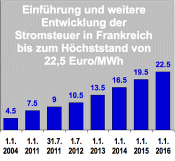 Die Stromsteuer war bisher in Frankreich noch um 2 Euro/MWh höher als in Deutschland. Bis vor kurzem wurde sie von kleineren Verbrauchern als "Contribution au Service Public de l'Electricité" (CSPE) und nur von leistungsgemessenen Kunden als TICFE erhoben, mit Beginn des Jahres 2022 aber unter der letzteren Bezeichnung vereinheitlicht. Als weitere staatliche Belastungen des Strompreises gibt es die "Contribution Tarifaire d'Acheminement" (CTA), die "Taxes sur la Consommation Finale d'Electricité" (TCFE) sowie die Mehrwertsteuer TVA ("Taxe sur la Valeur Ajoutée). Indessen war die staatliche Belastung des Strompreises in Frankreich mit 34 Prozent des Endpreises schon bisher wesentlich geringer als in Deutschland (54 Prozent) und lag auch deutlich unter dem EU-Durchschnitt (41 Prozent), wie den Eurostat-Angaben für einen Jahresverbrauch zwischen 2500 und 5000 Kilowattstunden im Jahr 2019 zu entnehmen ist.