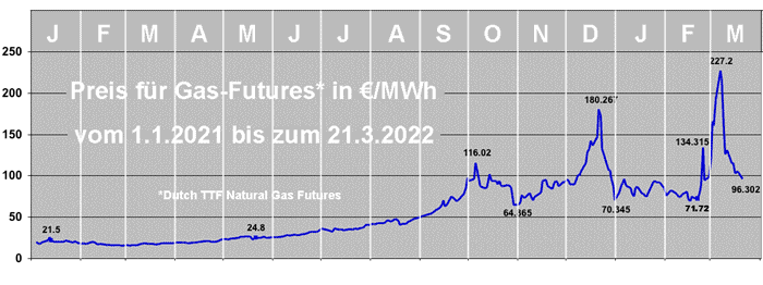 Diese doppelbödige Botschaft konnte als Drohung wie als Entwarnung verstanden werden. In der aktuellen Situation trug sie offenbar dazu bei, dass der Gaspreis am nächsten Tag wieder sank. Und während nun auch rund hundert Abgeordnete aus allen Fraktionen des EU-Parlaments ein Embargo für russische Gas- und Öleinfuhren verlangten, sank er kontinuierlich weiter, bis er am 21. März mit 96,30 Euro/MWh wieder zweistellig war.