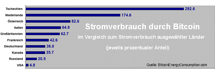 | Allein der Stromverbrauch für das Mining von Bitcoins und den damit verbundenen Zahlungsverkehr verschlingt gegenwärtig schätzungsweise 200 Terawattstunden jährlich. Das ist knapp dreimal soviel wie Tschechien verbraucht. Auch der deutsche Strombedarf ließe sich damit um mehr als ein Drittel decken. Die Herstellung von Bitcoins erfolgt deshalb vorwiegend an Orten, wo Strom besonders billig ist. Zum Beispiel im Iran, wo es Öl im Überfluss gibt und die Kilowattstunde deshalb zeitweise nur 0,04 Dollar kostete. Allerdings mussten die Mullahs das Mining dann doch beschränken, weil die Netze unter der Überlastung zusammenbrachen. Andere zeitweilige Eldorados für Bitcoin-Schürfer waren China, Kasachstan oder in Europa der Kosovo (siehe unten). Für die weltweite Umweltbelastung durch Treibhausgase spielt es freilich keine Rolle, wo die stromfressenden Rechner zur Erzeugung von Bitcoins aufgestellt werden. |
