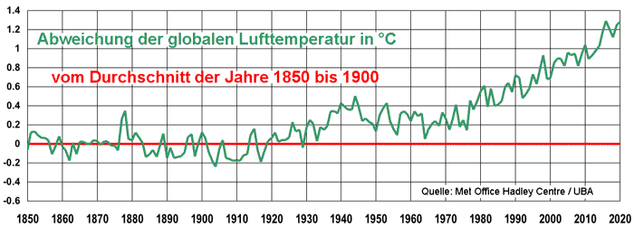 | Als Referenz für den Anstieg der Erderwärmung dient die durchschnittliche globale Lufttemperatur in der zweiten Hälfte des 19. Jahrhunderts. Wie diese Grafik erkennen lässt, hat die Durchschnittstemperatur bis 2020 schon um 1,3 Grad zugenommen. |