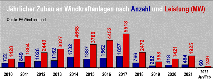 Bei Windkraft an Land ist der Zubau seit 2018 stark rückläufig. Er müsste in diesem und den beiden folgenden Jahren insgesamt 13 Gigawatt betragen, um das im neuen EEG vorgesehene Ausbauziel von insgesamt 69 GW zu erreichen. Das entspräche pro Jahr etwa 4,3 MW und damit knapp dem 2016 erreichten Kapazitätszuwachs. Bis 2030 soll die installierte Gesamtleistung dann auf rund 115 GW steigen. Dies würde ab 2025 einen jährlichen Zubau von durchschnittlich 7,7 GW voraussetzen. Die dafür erforderliche Trendwende ist indessen bisher nicht in Sicht, wie der noch immer kümmerliche Zubau im Januar/Februar in dieser Grafik zeigt. Auch im gesamten ersten Quartal 2022 wurde er mit 381 MW nicht viel besser und blieb sogar um 29 Prozent hinter dem Vorjahresergebnis zurück.