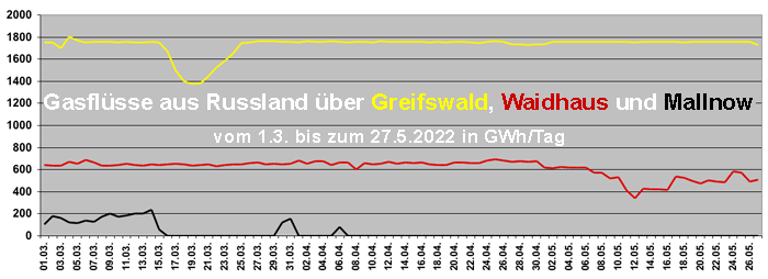 Seit April benutzt die Gazprom die durch Polen führende Jamal-Pipeline überhaupt nicht mehr, weshalb die am Grenzübergangspunkt Mallnow ankommenden Gasmengen auf null gesunken sind. Stattdessen liefert sie die vereinbarten Mengen vor allem über die Ostsee-Pipeline (Greifswald). Der Einbruch, der hier Mitte März auftrat, war wohl auf temperaturbedingte Minderabnahmen der Importeure zuruckzuführen. Dagegen hat die im Mai registrierte Verringerung der Gasflüsse am Grenzübergangspunkt Waidhaus mit dem Krieg in der Ukraine zu tun: Die dortigen Behörden sperrten einen Teil der Durchflüsse mit der Begründung, dass sie infolge der russischen Besetzung des Gebiets Luhansk nicht mehr für die notwendige Überwachung und Sicherheit der Infrastruktur sorgen könnten. Quelle: Bundesnetzagentur