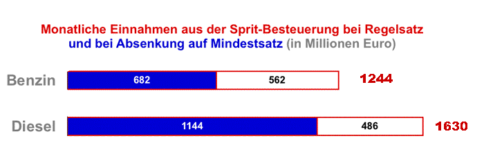 Nach Angaben der Bundesregierung erbringen die Energiesteuern auf Sprit bisher im Monatsdurchschnitt 2.883 MIllionen Euro. Davon entfällt mehr als die Hälfte auf Diesel (56,54 %), gefolgt von Benzin (43,15 %), Flüssiggas (0,24 %) und Erdgas (0,07 %). Durch die vorübergehende Absenkung des gesetzlichen Regelsatzes auf den europäischen Mindestsatz sinkt diese Summe um etwa ein Drittel auf 1.830 Millionen Euro. Über alle drei Monate hinweg entstehenden so dem Staat Mindereinnahmen von 3,16 Milliarden Euro.