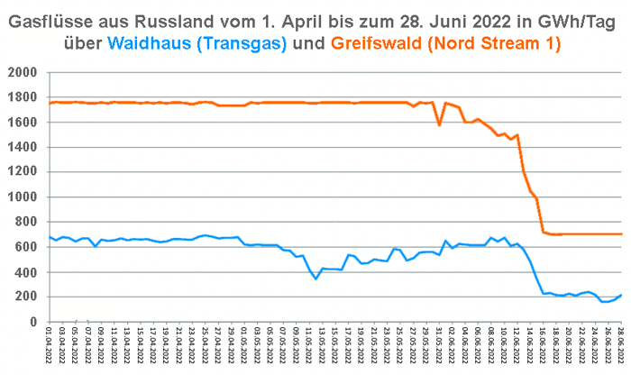 Die Gasflüsse auf Nord Stream 1 sind Anfang Juni stark zurückgegangen. Mitte Juni sind sie dann geradezu abgestürzt bis auf etwa 40 Prozent des früheren Niveaus. Auch über die Transgas-Pipeline, die durch die Ukraine, Slowakei und Tschechien nach Deutschland führt, kommt weniger als ein Drittel der früheren Mengen an. Wenn das so bleibt, ist nach Einschätzung der Bundesnetezagentur ein Speicherstand von 90 Prozent bis November kaum mehr ohne zusätzliche Maßnahmen erreichbar. Von der Reduktion sind auch andere europäische Länder wie Frankreich, Österreich und Tschechien betroffen. Quelle: Bundesnetzagentu