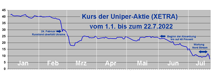 Zu Jahresanfang kostete die Uniper-Aktie noch um die 40 Euro. Schon Mitte Februar begann sie aber zu schwächeln, um dann am 24. Februar – als der russische Überfall auf die Ukraine begann – bis auf 28,63 Euro abzustürzen. Am 8. März war ein weiterer Tiefpunkt mit 17,8 Euro erreicht. Es folgte eine zweieinhalb Monate dauernde Erholung bis auf 25 Euro, die aber Anfang Juni in den Sinkflug überging, da Putin die russischen Gaslieferungen bis auf 40 Prozent der Normalmenge drosselte und damit das Milliarden-Defizit von Uniper entsprechend vergrößerte. Als die Pipeline Nord Stream ab 11. Juli zehn Tage lang zur Wartung abgeschaltet wurde, lag der Kurs unter zehn Euro. Er zog dann am 20. Juli wieder leicht an, nachdem bekannt wurde, dass die Lieferungen nicht ganz gestoppt, sondern im bisherigen reduzierten Umfang wiederaufgenommen würden. Schon einen Tag später stürzte er aber weiter ab und lag am 22. Juli nur noch bei 7,47 Euro. Das vereinbarte Aktienpaket von rund 30 Prozent überlässt Fortum dem Bund nicht zum aktuellen Börsenkurs, sondern zum Nennwert von 1,70 Euro je Anteilsschein. Der Kaufpreis ist also gut fünfmal geringer als der ohnehin schon sehr niedrige Börsenwert. Insofern sind diese 267 Millionen Euro ein echter Schnäppchenpreis. Allerdings wiegt er bei weitem nicht die Belastungen auf, die Bund, Steuerzahlern und Verbrauchern an anderer Stelle entstehen. |