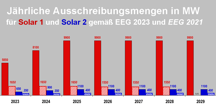 | Die im EEG 2023 vorgesehenen Ausschreibungsmengen für Solarstrom sind ab 2025 mehr als sechsmal so groß wie im EEG 2021. Der absolute Schwerpunkt sind dabei Freiflächenanlagen ("Solar-Segment 1"). Die auf Dächern, an Fassaden oder Lärmschutzwänden angebrachten Solarmodule ("Solar-Segment 2") werden dagegen vor allem über feste Einspeisungsvergütungen gefördert und spielen in dieser Leistungskategorie (über 750 Kilowattt) nur eine untergeordnete Rolle. Beim Solar-Segment 2 ist das Ausschreibungpotential auch wesentlich geringer, weshalb sich das EEG 2023 hier mit einer weniger als halb so großen Aufstockung begnügt. Die separaten Ausschreibungen für beide PV-Segmente wurden mit dem EEG 2021 eingeführt (200905). |