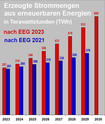 Als "Herzstück des Pakets" - so heisst es in einem Überblickspapier des Bundeswirtschaftsministeriums - wird im EEG der Grundsatz verankert, dass die Nutzung erneuerbarer Energien im überragenden öffentlichen Interesse liegt und der öffentlichen Sicherheit dient (220409). Zugleich wird als neues Ziel festgelegt, den Anteil der erneuerbaren Energien bis 2030 auf mindestens 80 Prozent am Bruttostromverbrauch zu erhöhen (statt nur auf 65 Prozent im EEG 2021). Im Durchschnitt der drei Vorjahre betrug dieser schwankende Anteil bisher 42,6 Prozent.