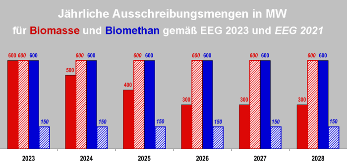 | Die bisherige Ausschreibungsmenge von 600 MW für Biomasse wird bis 2026 halbiert. Zugleich wird das Volumen für Biomethan ab 2023 vervierfacht. Daraus ergibt sich für Bioenergie ein zeitweiliger Zuwachs der Ausschreibungsmenge um 450 MW, der aber bis 2027 auf 150 MW zurückgeht. Biomethan ist ein wertvoller Ersatz für Erdgas, kann aber wie andere Arten der bioenergetischen Stromproduktion mit Rücksicht auf die Umwelt nur in beschränkten Mengen erzeugt werden. Deshalb darf Biomethan künftig nur noch für den Betrieb von Gaskraftwerken eingesetzt werden. |