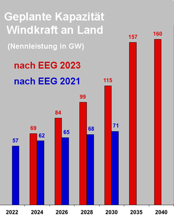 Entsprechend werden die Ausbaupfade deutlich angehoben. Die Leistung der Windenergie an Land soll um bis zu 10 Gigawatt (GW) pro Jahr steigen. Im Jahr 2030 sollen dann eine installierte Kapazität von rund 115 GW Windenergieanlagen an Land in Deutschland installiert sein (Ende März 2022 waren es 56,2 GW, als knapp die Hälfte). Die Degression des Höchstwerts für die Förderung von Wind an Land wird für zwei Jahre ausgesetzt, um so die Anreize für mehr Tempo beim Windausbau zu erhöhen. Das sogenannte Referenzertragsmodell, ein Berechnungsmodell für die EEG-Vergütung, wird für windschwache Standorte verbessert und die Größenbegrenzung für Pilotwindenergieanlagen aufgehoben. Das Gesetz zur Erhöhung und Beschleunigung des Ausbaus von Windenergieanlagen an Land beseitigt weitere Hemmnisse des Ausbaus der Windenergie an Land (siehe unten).