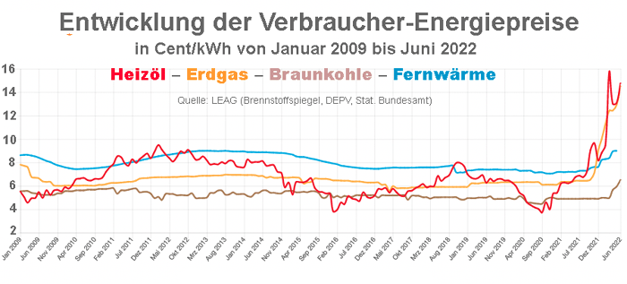 Dagegen würden sich die Brennstoffkosten für dieselbe Wärmemenge bei der Umstellung von Gasheizung auf Braunkohle-Briketts verringern (was natürlich voraussetzt, dass die erforderlichen Öfen und Kamine vorhanden sind). Die bereits erwähnten Jahreskosten für eine Durchschnittswohnung mit einem Verbrauch von 12.742 Kilowattstunden sinken von 2.039 Euro auf 765 Euro, wenn beim Gas ein Preis von 16 Cent/kWh und bei Braunkohle-Briketts von 6 Cent/kWh zugrundegelegt wird, wie ihn die obenstehende Grafik noch für Juni 2022 anzeigt. Die Ersparnis beliefe sich also auf über 60 Prozent.