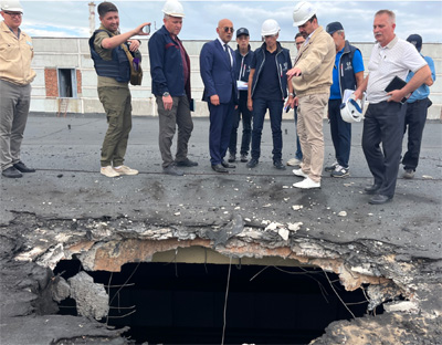 Die IAEA-Experten besichtigen ein durch Beschuss verursachtes Loch im Dach eines Spezialgebäude des KKW Saporischschja, in dem unter anderem frische Brennstäbe und das Lager für feste radioaktive Abfälle untergebracht sind. Foto: IAEA
