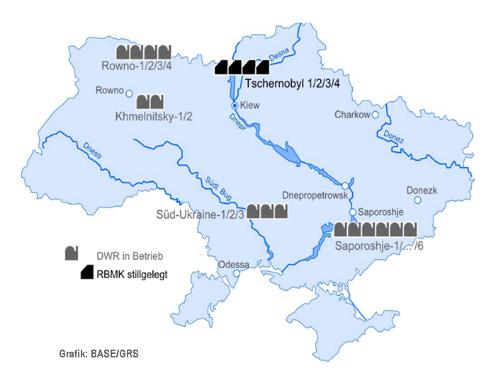 Die Ukraine betreibt an den vier Standorten Saporischschja (Saporoshje), Mykolajiw, Riwne (Rowno) und Chmelnyzky (Khmelnitsky) insgesamt 15 Reaktoren mit einer Gesamtleistung von 13 Gigawatt. Es handelt sich durchweg um Druckwasserreaktoren, die – mit Ausnahme von zwei älteren Blöcken – jeweils eine elektrische Nettoleistung von 950 MW erbringen. Das Kernkraftwerk Saporischschja (Saporoshje) im Süden des Landes ist dabei mit sechs Reaktoren und 5700 MW sowohl das größte Kernkraftwerk der Ukraine als auch in Europa, gefolgt von Mykolajiw ("Süd-Ukraine") mit 2850 MW, Riwne (Rowno) mit 2657 MW und Chmelnyzky (Khmelnitsky) mit 1906 MW. Ein großes nukleares Sicherheitsrisiko sind außerdem weiterhin die sechs stillgelegten bzw. zerstörten RBMK-Reaktoren des ehemaligen Kernkraftwerks Tschernobyl, auf dessen Gelände sich am 26. April 1986 mit der Explosion des Blocks 4 die weltweit bisher größte KKW-Katastrophe ereignete.