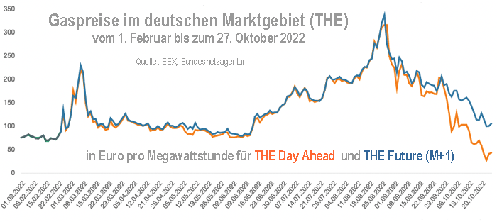 Der Rückgang der Gaspreise hat verschiedene Ursachen. Eine davon ist sicher auch, dass die deutschen Gasspeicher Ende Oktober zu gut 98 Prozent gefüllt waren. Damit entfallen die forcierten Gasbeschaffungen, mit denen die "Trading Hub Europe" (THE) im Auftrag der Bundesnetzagentur bisher für die Auffüllung der Speicher gesorgt und damit zugleich die Preise in die Höhe getrieben hat. Außerdem steht inzwischen mehr Flüssiggas (LNG) zur Verfügung als zunächst erwartet worden war. Das hat wiederum damit zu tun, dass in China die Konjunktur lahmt und dieser Großabnehmer in diesem Jahr wohl nur 65 statt 80 Millionen Tonnen LNG importieren wird. Vor der spanischen Küste stauten sich zeitweilig die LNG-Tanker, weil die Terminals ausgelastet waren. Wegen des temporären Überangebots sank am 24. Oktober der TTF-Preis sogar kurzzeitig in den negativen Bereich. Die Käufer erhielten dadurch das Gas kostenlos plus einer Zugabe von mehr als 10 Euro/MWh.