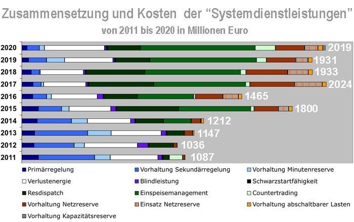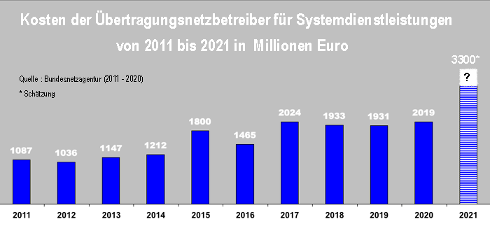 Die Kosten der sogenannten Systemdienstleistungen, aus denen sich die Netzentgelte der Übertragungsnetzbetreiber (ÜNB) ergeben, sind in im vergangenen Jahrzehnt um das Doppelte gestiegen. Ein weiterer und besonders hoher Anstieg ist aufgrund der bisher vorliegenden Zahlen für das Jahr 2021 zu erwarten. Im kommenden Jahr hätte sogar ein schlagartiger Anstieg der ÜNB-Netzentgelte um das Zweieinhalbfache gedroht, wenn der Bund nicht 13 Milliarden Euro zu ihrer Stabilisierung zur Verfügung stellen würde. Trotzdem werden die Netzentgelte wohl ähnlich stark steigen wie schon 2015 und 2017, da die ebenfalls erhöhten Kosten der Verteilnetzbetreiber ungedämpft auf die Stromrechnungen der Verbraucher durchschlagen. Die in der Grafik enthaltene Schätzung der Kosten für das Jahr 2021 beruht auf den bisher von der Bundesnetzagentur bekanntgegeben Steigerungen für diverse Netz- und Systemsicherheitsmaßnahmen, die bei sonst gleichbleibenden Kosten 2900 Millionen ergäben. Hinzu kommt ein mit Fragezeichen versehener Zuschlag von 400 Millionen für höhere Kosten bei Verlustenergie und anderen Systemdienstleistungen. |