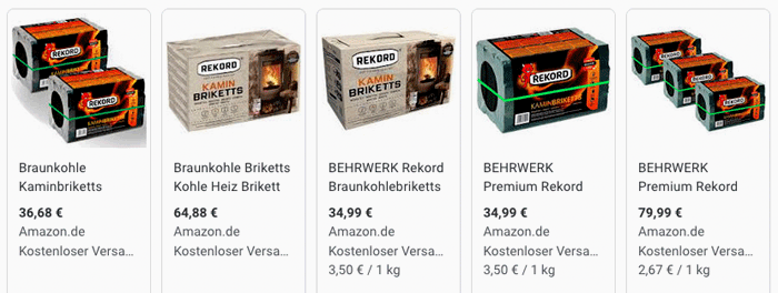 Im Internet wird die 10-Kilo-Packung mit REKORD-Briketts zu Phantasiepreisen angeboten, die rund zehnmal so hoch sind wie die ebenfalls gestiegenen Preise von seriösen Händlern. Im Vorjahr kostete die 10-Kilo-Tragepackung teilweise weniger als drei Euro. Anscheinend spekulieren derartige Angebote auf Leute, die nicht rechnen können, denn Gasheizung ist da immer noch günstiger... |
