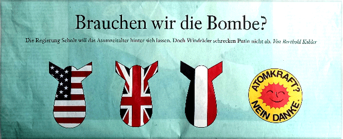 Das Rätselraten darüber, was die "Frankfurter Allgemeine" wohl veranlasst haben mag, schon seit mehr als einem Jahr eine Kampagne zur Neubelebung der Kernenergie in Deutschland zu führen, scheint jetzt ein Ende zu haben: In der FAZ-Sonntagszeitung vom 30. Oktober plädierte der FAZ-Mitherausgeber Berthold Kohler erstmals öffentlich für den Aufbau einer eigenen deutschen Atomstreitmacht. Die in der ENERGIE-CHRONIK vom Juni geäußerte Vermutung, dass bestimmte Kreise von Politik und Wirtschaft die Neubelebung der Kernenergie in Deutschland deshalb fordern, um eine möglichst weitgehende Substituierung fossiler Energien durch mit Atomstrom erzeugtem Wasserstoff zu erreichen, wäre demnach nicht der Hauptgrund, sondern eher ein zusätzliches Motiv (siehe Hintergrund, Juni 2022).